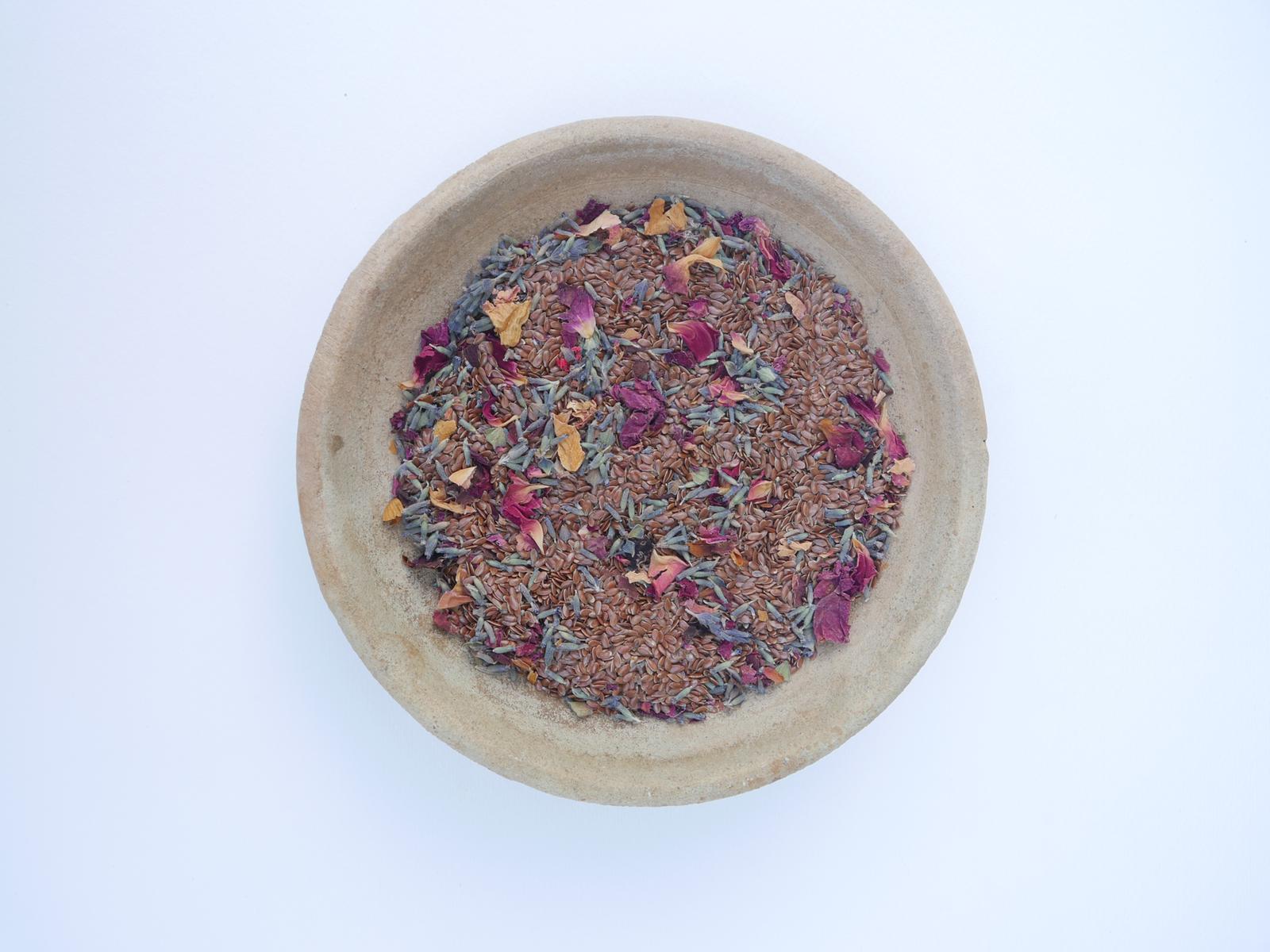 מפרחי לבנדר, עלי כותרת של ורדים וזרעי פשתן אורגנים.