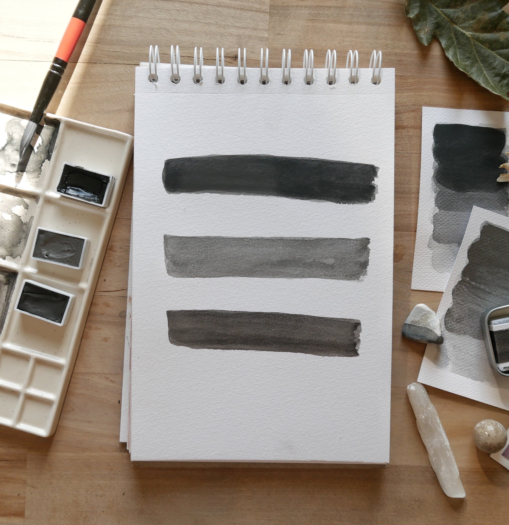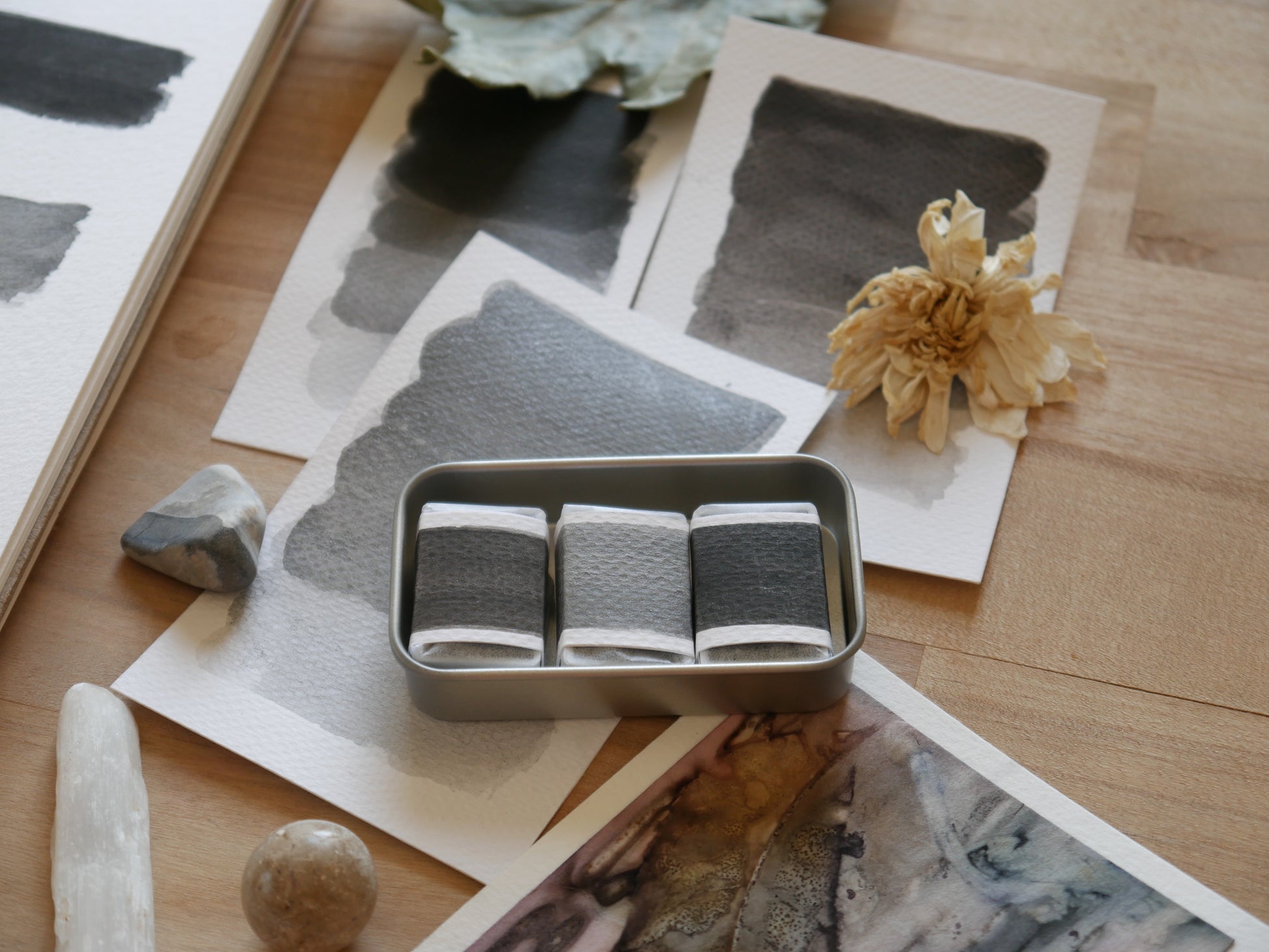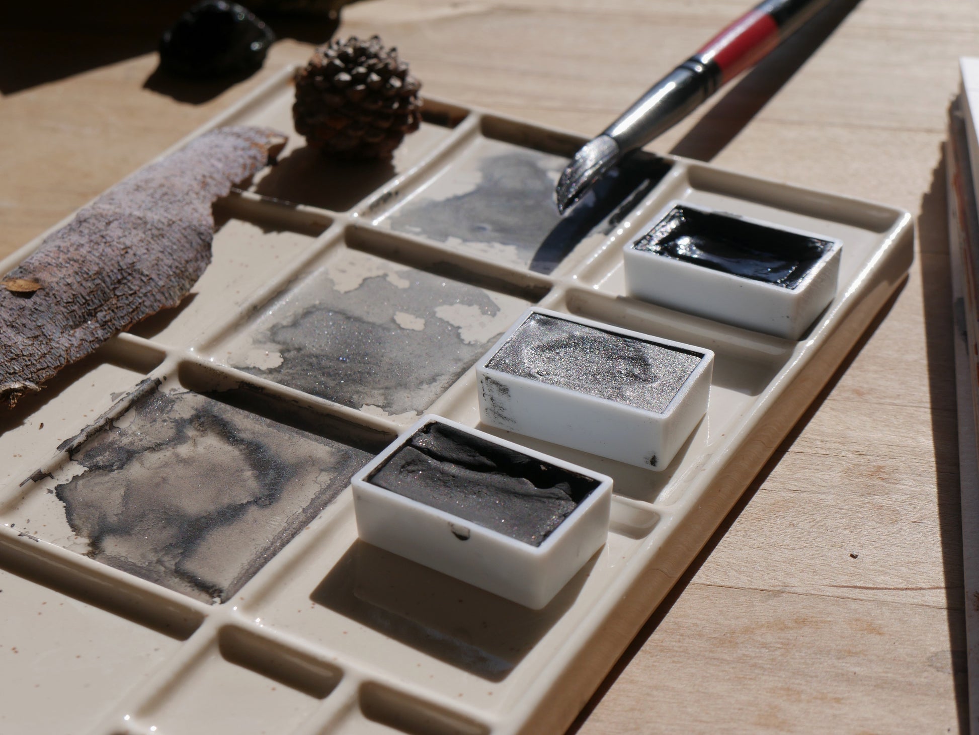 גרפיט - כן ממש הגרפיט שיש בעפרונות שלנו רק הפעם בגרסת צבעי מים. צבע בעל משקל וכובד מסויים עם נצנוץ טבעי קל. הגוונים שלו נעים בין אפור בהיר לאפור כהה ואטום.